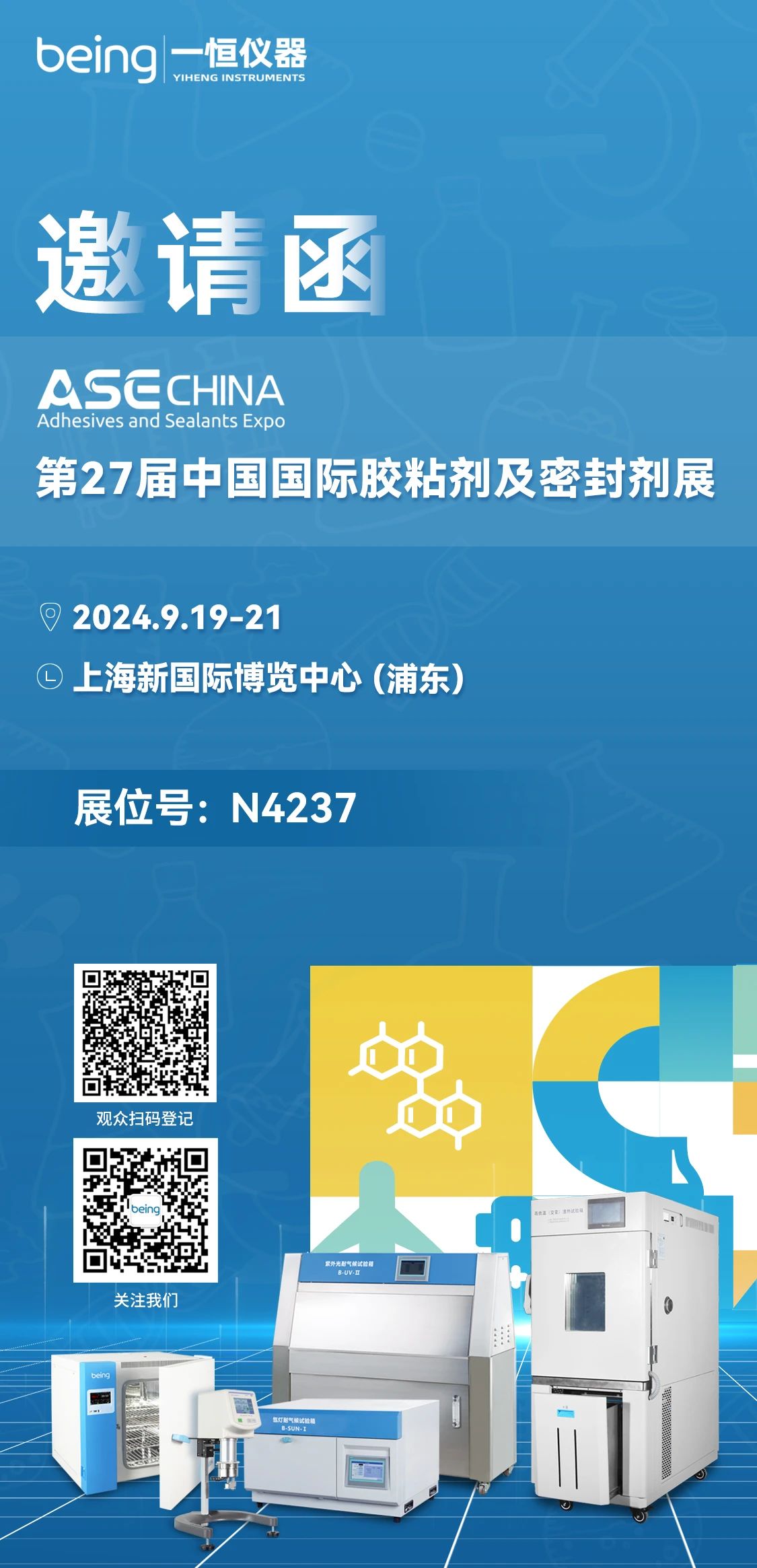 2024-09-13 | 文章來源: | 點(diǎn)擊率: 國際膠粘劑及密封劑展覽會(ASE CHINA)是以膠粘劑、密封劑、膠粘帶及薄膜為一體的專業(yè)展覽會已獲得UFI權(quán)威認(rèn)證。第27屆國際膠粘劑及密封劑展將于2024年9月19-21日在上海新國際博覽中心舉辦。本次展覽會,我司將攜高低溫(交變)濕熱試驗(yàn)箱、氙燈耐氣候試驗(yàn)箱、紫外光耐氣候試驗(yàn)箱、鼓風(fēng)干燥箱、均質(zhì)分散機(jī)和新款粘度計(jì)等產(chǎn)品亮相N4237展臺,期待您蒞臨現(xiàn)場,交流合作。