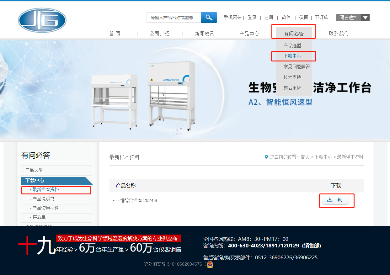 2、點擊導(dǎo)航欄“有問必答”中的“下載中心”找到“最新樣本資料”即可點擊下載。
