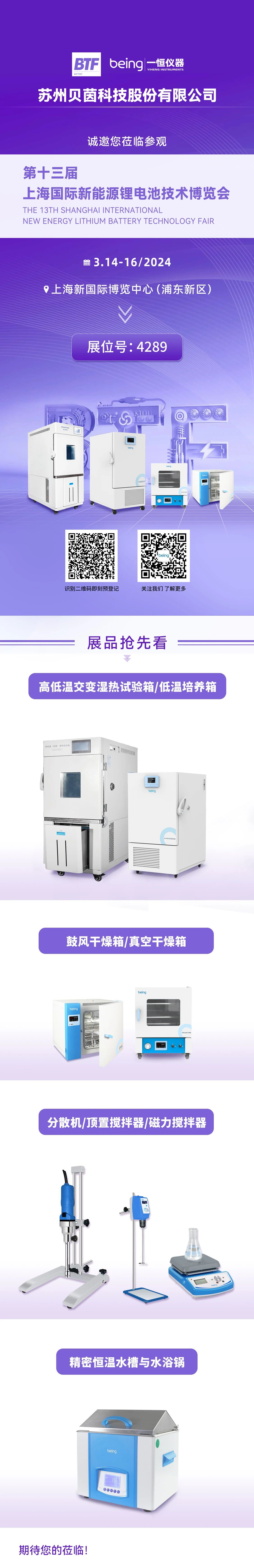 2024-03-11 | 文章來(lái)源: | 點(diǎn)擊率: BTF2024第十三屆上海國(guó)際新能源鋰電池技術(shù)展覽會(huì)將于3月14日至16日在上海新國(guó)際博覽中心舉辦,展品涵蓋動(dòng)力電池、儲(chǔ)能電池電芯、PACK、正負(fù)極材料、電解液、隔膜及配套材料、電池裝備等。本次展覽會(huì),貝茵科技將在E4館4289號(hào)展位,現(xiàn)場(chǎng)展示高低溫(交變)濕熱試驗(yàn)箱,低溫培養(yǎng)箱,真空干燥箱,粘度計(jì),磁力攪拌器等儀器設(shè)備。期待您蒞臨現(xiàn)場(chǎng),參觀指導(dǎo),交流合作!